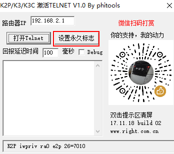 2、在175版本上用工具开启telnet,先点击“设置永久标志”,然后重启K3C,重启后再点击“打开telnet”,工具如下: