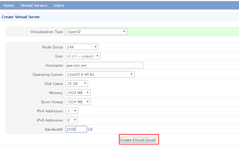 现在你可以卖小鸡了,将刚才新建vps的IP地址以及root密码发给你的客户,并且将客户后台管理的url(第一个图第二个红框)、用户名(cctest1)和密码(新建用户时创建的密码)发给客户即可。