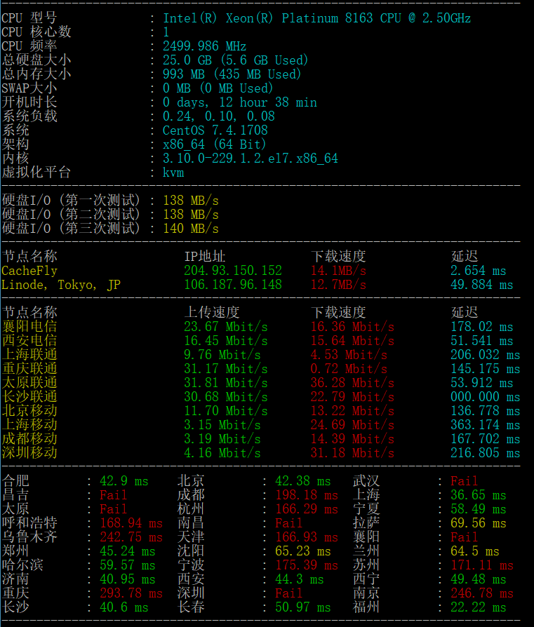 经实测,目前电信线路绕道日本,晚上速度较差,建议安装锐速,会有明显改善,另此套餐对CPU限制严格,比如用来编译会杀进程导致编译失败
