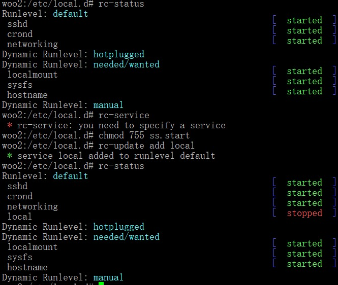 Alpine Linux 的开机自启目录在/etc/local.d下,在此目录下建立已.start为后缀的文件,如ss.start